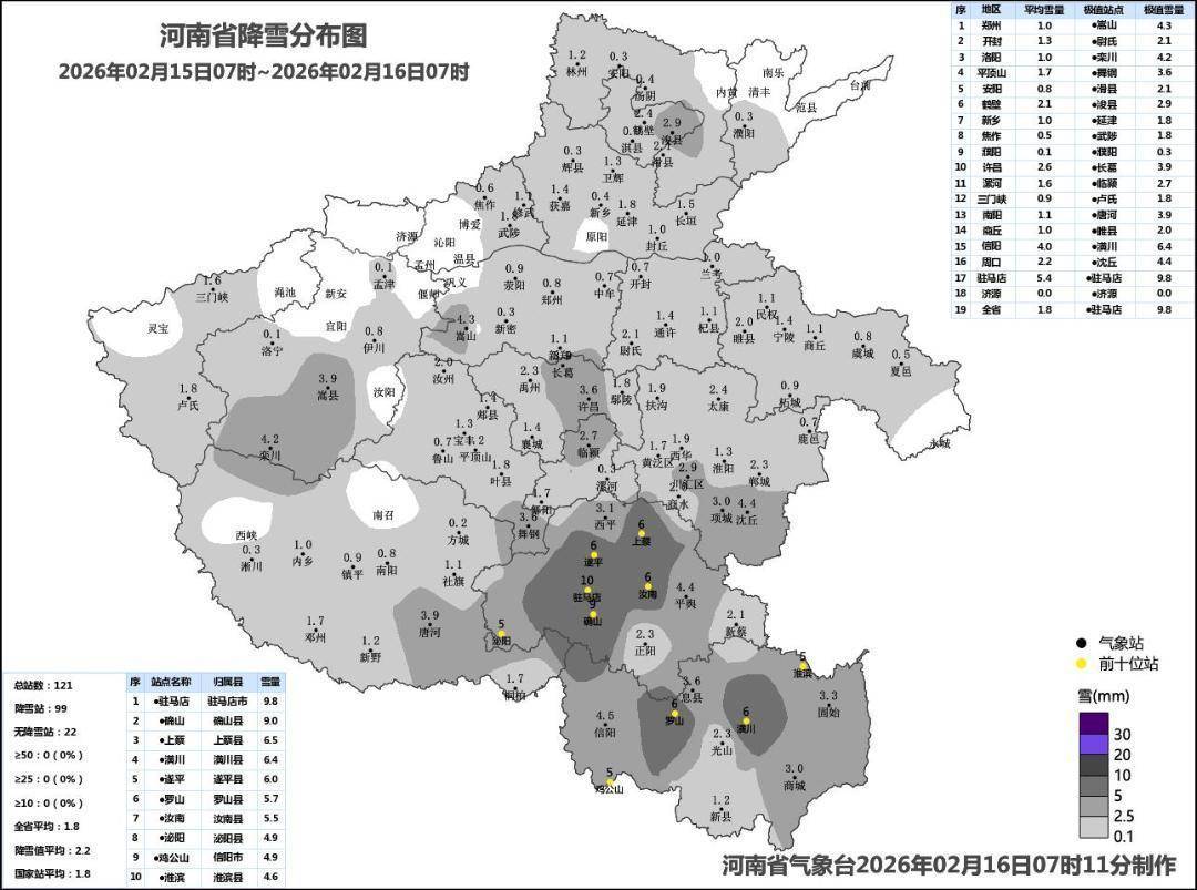 2月15日7时至16日7时,我省淮河以北出现小到中雪,驻马店部分县(市、区)大雪;淮河以南小到中雨转中到大雪。最大降水量为商城14.7毫米,最大降雪量为驻马店9.8毫米。16日5时全省大部有1到5厘米积雪,驻马店部分县(市、区)积雪深度5到10厘米,最大积雪深度驻马店11厘米。