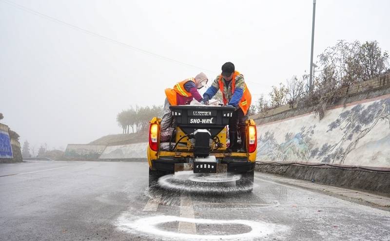当天一早,位于纳雍县珙桐养护段仓库里的一袋袋工业盐和融雪剂就被调配装车,紧急运往勺窝镇务井村山王庙结冰路段。路面上,纳雍县交通运输局农村公路养护中心的工作人员正紧张作业。机器启动,喷头高速旋转,白色的融雪盐均匀地喷撒,瞬间覆盖了原本湿滑的冰层。