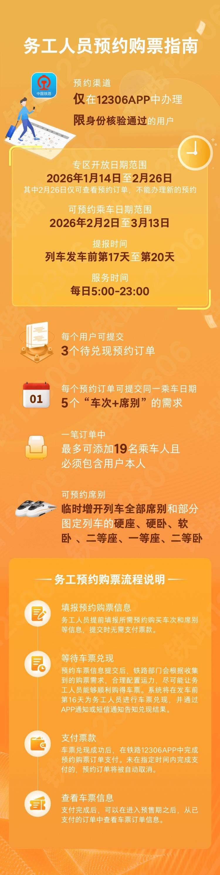2026年春运,铁路12306继续推出务工人员预约购票专区服务。现在起到2月26日,已通过实名制核验的务工人员可预约购买2月2日至3月13日的火车票。